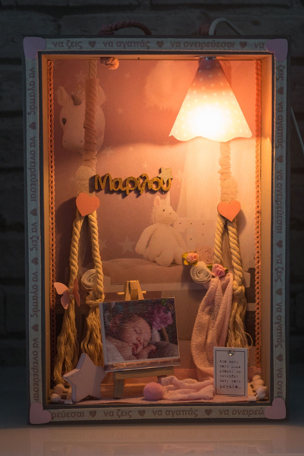 Είναι ιδανικό προσωπικό δώρο που θα μείνει για πάντα, φτιαγμένο με πολλή αγάπη. Τοποθετείται στον τοίχο, σε ράφι ή έπιπλο. Μπορείτε να προσθέσετε ένα όνομα. Περιλαμβάνει λάμπα χαμηλής κατανάλωσης και καλώδιο 1,80m. Παραδίδεται μετά από 5-8 εργάσιμες μέρες σε πολυτελές και καλαίσθητο κουτί συσκευασίας.
