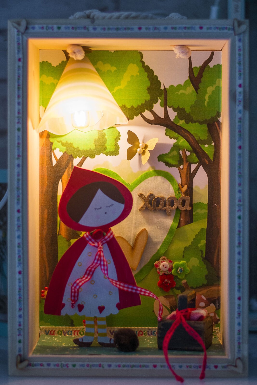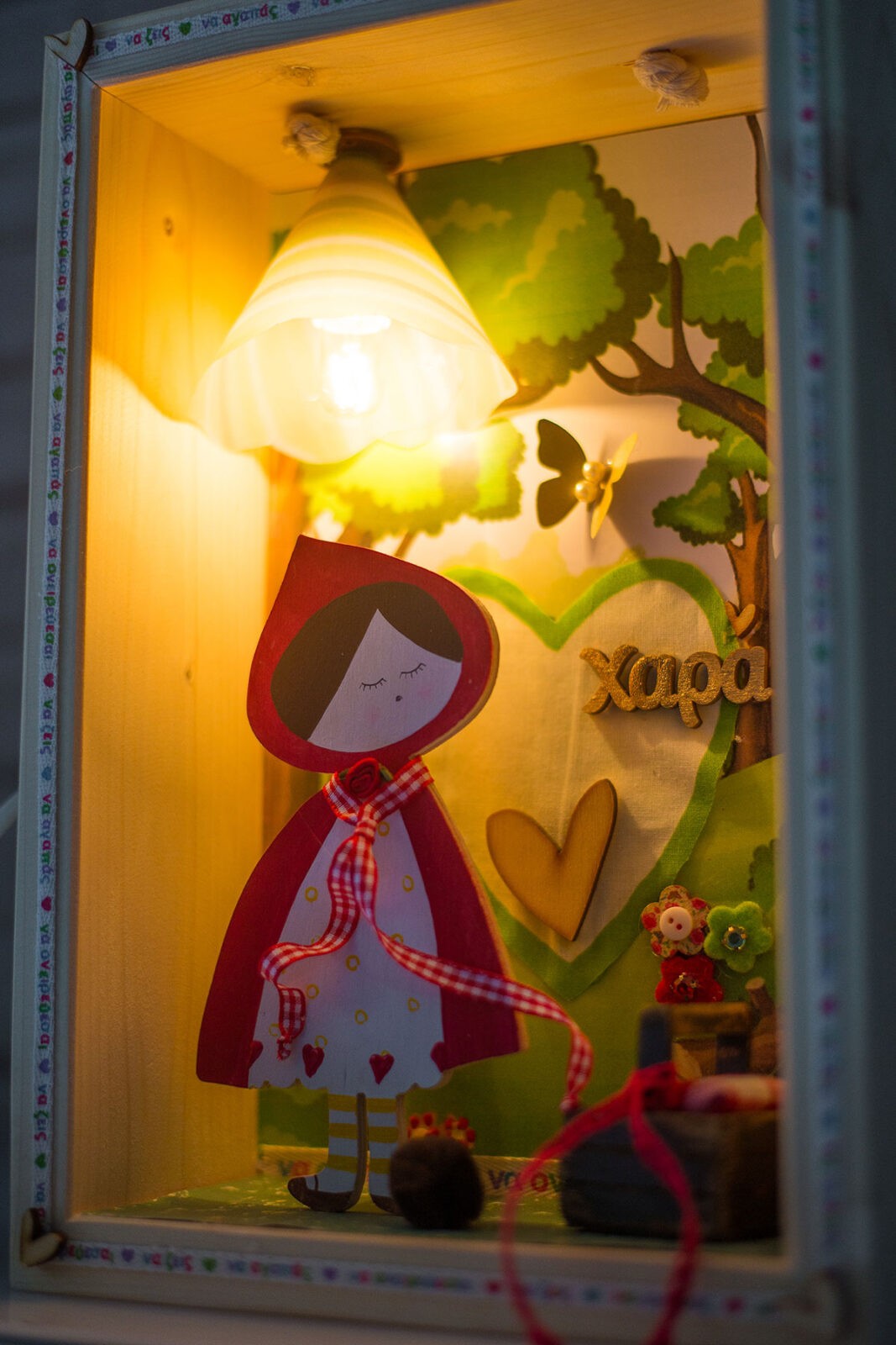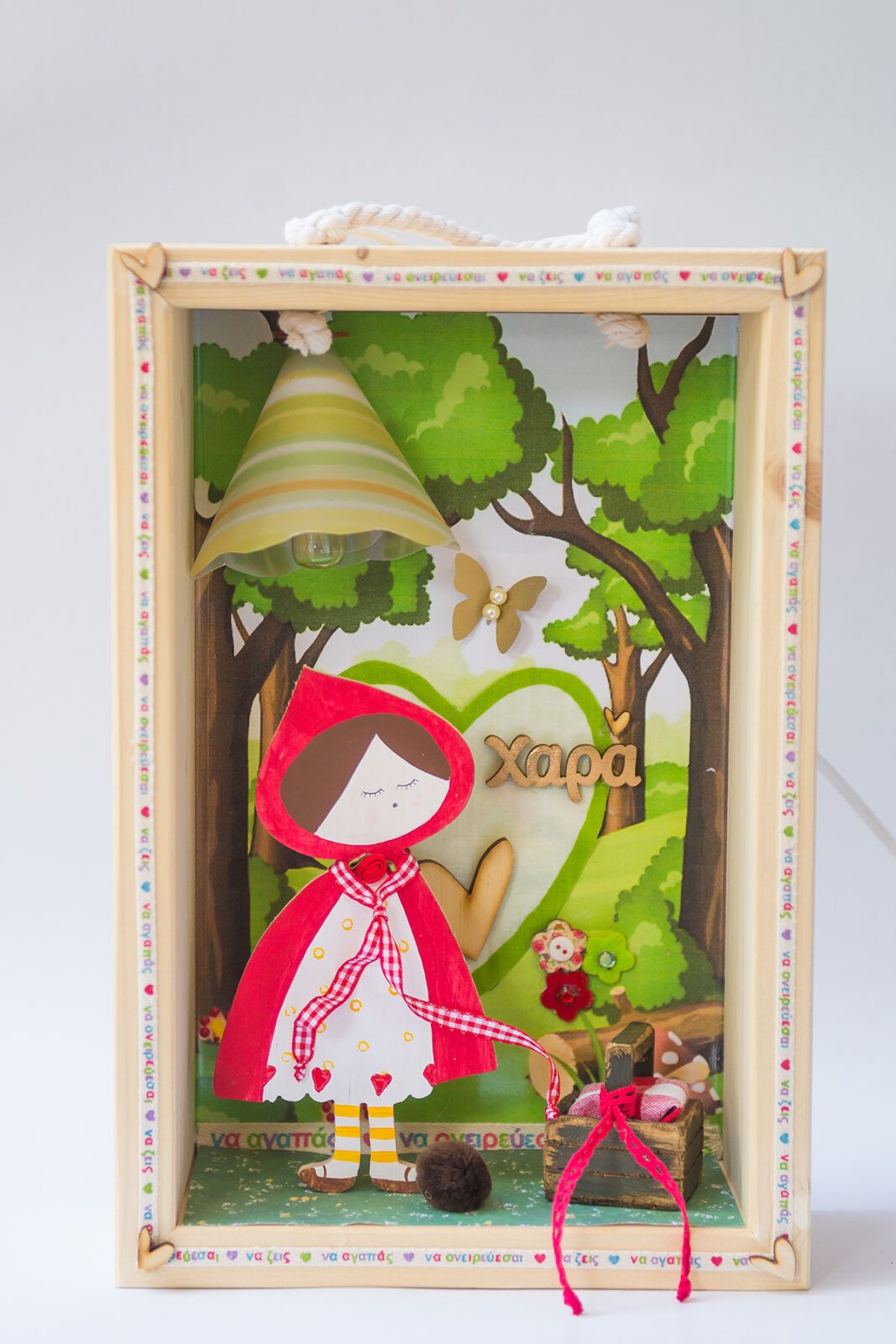 100% χειροποίητο φωτιστικό “Red Riding Hood” (Κοκκινοσκουφίτσα) κατασκευασμένο από ξύλο, μία όμορφη ιδέα για τη διακόσμηση του δωματίου ενός κοριτσιού, σε φυσικό χρώμα ξύλου και κανονικό (35*24*11cm) μέγεθος.